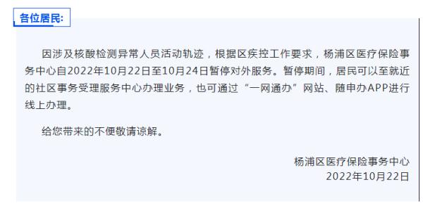 22日,“杨浦医保”微信公众号发布通知,根据区疾控工作要求,杨浦区医疗保险事务中心自2022年10月22日至10月24日暂停对外服务。暂停期间,居民可以至就近的社区事务受理服务中心办理业务,也可通过“一网通办”网站、随申办APP进行线上办理。