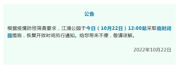 根据疫情防控筛查要求,江浦公园于10月22日12:00起采取临时闭园措施,恢复开放时间另行通知。