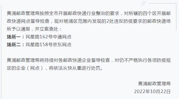 22日,“上海杨浦”微信公众号发布情况通报,黄浦邮政管理局按照全市开展邮政快递行业整治的要求,对所辖的四个区开展邮政快递网点督导检查,现对杨浦区范围内发现的2处违反防疫要求的邮政快递场所予以通报,并立案查处: