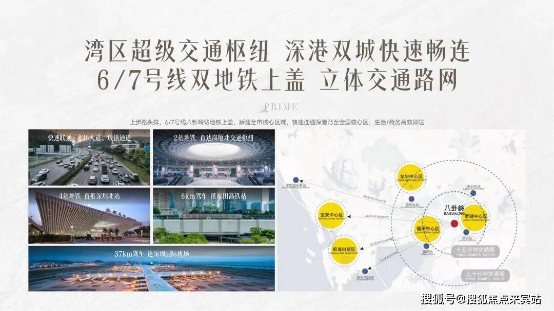 6/7号线站地铁直达岗厦北交通枢纽,4站地铁直抵深圳北站;快速连通北环大道、坂银通道,驾车6km抵福田高铁站、驾车37km达深圳国际机场,快速连通全市、深港乃至全国核心区,生活、商务高效即达。